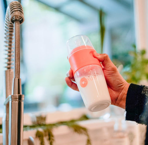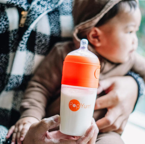 PopYum conserve séparément le lait en poudre et l'eau dans le biberon. Lorsque bébé a faim, appuie simplement sur les boutons ("pop"), secoue plusieurs fois et "Yum", c'est prêt !